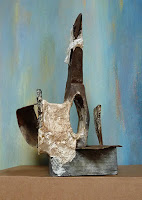 Ich war nahe dran das "Schwarzwaldschifferl" (so Harald) sozusagen einfach unter den Tisch fallen zu lassen, da es mir selbst Rätsel aufgibt und nicht wirklich zusagt(e) .... doch nun steht es seit einigen Tagen direkt vor meiner Nase (ich hatte keine Zeit Fotos zu machen) und nach und nach habe ich doch einiges gefunden, das mir gut gefällt. So, wie im ersten Bild, das Gesicht, das sich im "Segel" zeigt und die unterschiedlichen Strukturen von Holz, Moos und der rostigen Unterplatte (siehe Bild 2). Und, wenn ich einen Weg finde es, so wie im dritten Bild, an der Wand zu befestigen, wäre das toll, denn ich finde es gibt auch ein prima Bild ab.
